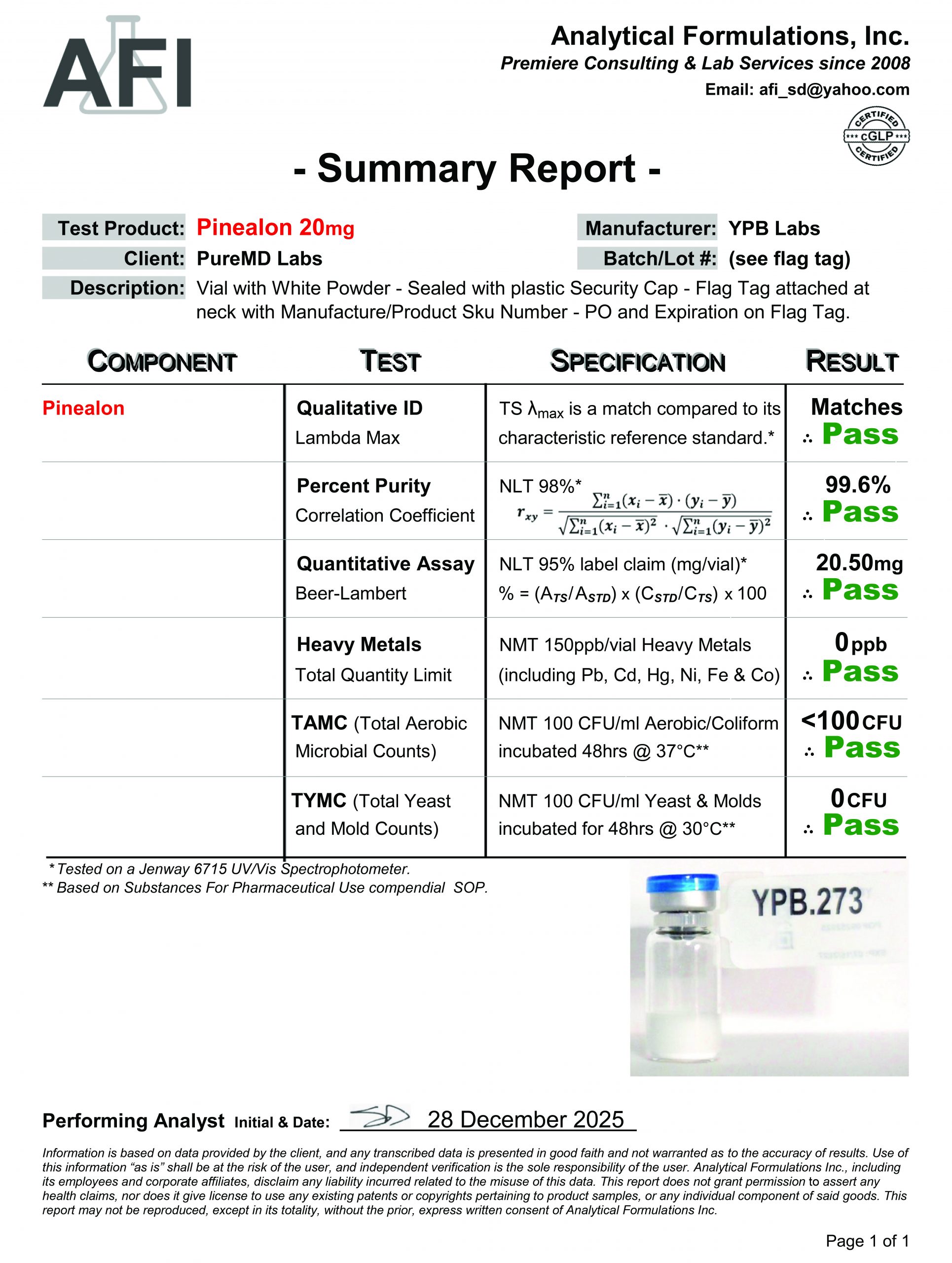 Tamper-evident seal; lot & test date on each vial